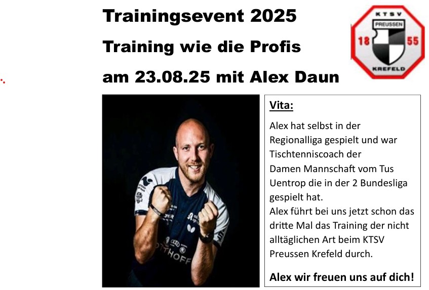 KTSV Preussen 1855 KrefeldTischtennis23.08.2025 11:00 Trainingsevent mit Alex ![]() 23 Aug Wieder ein voller Erfolg war das Trainingsevent am 23.08.2025 mit Alex Daun. In drei Trainingsgruppen wurden jeweils für 2h an 8 Tischen trainiert. Der Schweiß lief dennoch waren alle mit viel Spaß dabei. 42 Trainingswillige hatten sich angemeldet. Auch 10 externe Spieler aus den Ve... mehr 24.05.2025 14:00 Vereinsmeisterschaft Erwachsene 2025 ![]() 24 May Bei den Vereinsmeisterschaften der Erwachsenen waren in diesem Jahr 26 Teilnehmer im Doppel und Einzel am Start. An 8 Platten wurde um die Plazierungen gekämpft.Trotzdem blieb bei Kaffee, Kuchen, Pizza und kühlen Getränken immer zeit zur Stärkung. Dank an alle Helfer für den... mehr 17.05.2025 13:00 Vereinsmeisterschaften Jugend 2025 ![]() 17 May Am 17.05.2025 wurde die Jugendvereinsmeisterschaften ausgespielt. 16 Jugendliche nahmen in diesem Jahr teil. Mit Kuchen; Getränken und Pizza wie immer ein voller Erfolg. Clemens holte sich wie im letzten Jahr den Titel des Vereinsmeister. Bertan wurde zum ersten Mal Vereinsmeister der Gruppe B... mehr 26.11.2024 18:00 Neues Preussen-Team ab Januar 2025 am Start ![]() 26 Nov Anbei unser neues Preussen-Team das zur Rückrunde als neu gemeldete Mannschaft in der 4 Bezirksklasse an den Start geht. Wir wünschen dem Team weiterhin viel Spass bei uns und viel Erfolg bei den Meisterschaftsspielen Auf dem Foto: Konrad Panic, Sascha Dahlen, Rocco Ludwig und Marlon Ehs... mehr 11.05.2024 18:00 Vereismeisterschaft Jugendliche 2024 ![]() 11 May Bei den Jugendvereinsmeisterschaften gingen in Einzel und Doppel 15 Kids an den Start. Die Preise, Medallien für alle Kids lagen bereit. Mit Kuchen, Getränken und Pizza wurden alle bestens versorgt. Wir hatten alle viel Spass und spannende Spiele. Dank an die Eltern die Kuchenspenden berei... mehr 27.04.2024 20:00 Vereinsmeisterschaft Erwachsene 2024 ![]() 27 Apr Wir [Peter und Uli] vom KTSV Preussen Krefeld möchten uns bei allen Beteiligten, sei es nun aktiv/passiv oder als Helfer im Hintergrund für Euer kommen und Eure Unterstützung bedanken. Ein besonderer Dank gilt nochmals Christel Plum , Marcus Zipper und Eike Hülsmann die uns im Vo... mehr 17.03.2024 16:00 TT-Bundesliga-Event ![]() 17 Mar Am 17.03.2024 ging es zum Live Event nach Düsseldorf. 32 Preussen waren dabei. Auch einige Jugendspieler waren zum erstenmal bei einem Tischtennis Bundesligaspiel "Live" dabei. Im ARAG Center Court gewann schließlich der TSV Bad Königshofen in einem spannenden Spiel mit 3:2. Leider s... mehr 27.01.2024 15:00 Event Kletterpark Viersen ![]() 27 Jan Zum verspäteten Weihnachtsevent ging es mit unseren Kids zum Indoor-Kletterpark nach Viersen. 18Kids und 5 Betreuer/Fahrer waren dabei. Alle hatte viel Spaß und von dem ein oder anderen wurde sogar die Höhenangst etwas reduziert. Tolles Feadback von Kindern und Eltern.......gerne wie... mehr 24.09.2023 18:00 Trainingsevent mit Alex Daun ![]() 24 Sep Alex ließ es wieder krachen. In drei Trainingsgruppen wurde Jugend, Erwachsene Gruppe A und Erwachsene Gruppe B von Alex für jeweils 2h trainiert. Auch einige externe Spieler [aus der andro Cup Serie] waren dabei. Insgesamt waren über 40 Tischtennisspieler beim Trainingevent am Start... mehr 14.08.2023 09:00 Preussen trauert um Wilfried Weisters ![]() 14 Aug Unsere gute Seele Wilfried Weisters ist am 14.08.2023 leider verstorben. Er gehörte lange Jahre zu den Stützen in unserem Verein und war eine feste Größe im Krefelder Tischtennissport. Als Spieler war er schon sehr erfolgreich. Er gab sein können und wissen aber gerne als J... mehr 17.06.2023 19:00 Erster ANDRO WTTV CUP beim KTSV Preussen Krefeld ![]() 17 Jun Die ersten drei andro WTTV Cups wurden am Wochenende beim KTSV Preussen Krefeld gestartet. Bis zu 16 Teilnehmern waren bei den gut besuchten Cups am Start. Sehr starke Teilnehmer hatten sich aus den unterschiedlichsten Regionen angemeldet. In bis zu 6 Einzel wurde der jeweilige Turniersieger ausgesp... mehr 25.04.2023 21:00 Pokalsieger 2023 Kreisliga ![]() 25 Apr Toller Saisonabschluss! Nachdem die erste Herren-Mannschaft bereits aufgestiegen ist holte sie sich im Pokal-Endspiel noch den den Pokalsieg auf Kreisliga-Ebene. Denis Tomic, Marcel Heinrichs und Rudi Balzer [von links nach rechts] holten die Punkte zum 4:2 Sieg gegen Mitaufsteiger TTC BR Schaephu... mehr 01.04.2023 22:00 Aufstieg der Herren 2023 ![]() 01 Apr Am 1 April war es so weit [kein Aprilscherz] Die Erste gewann das Spiel gegen den Tabellen Dritten Bockum deutlich mit 9:1 und steigt als Tabellen-Zweiter direkt von der Kreisliga in den Bezirk auf. Zur neuen Saison werden die Bezirke neu eingeteilt somit werden wir auf einige völlig neue Manns... mehr 24.03.2023 17:00 Preussen Jugend Aktiv ![]() 24 Mar Am 24.03.2023 nahmen einige Jugendlichen vom Preussen Team bei einer Findungsveranstaltung in Krefeld teil. Einige tolle Aktionen waren dabei. Von Preussenseite wurd eine Tischtennisplatte bereit gestellt. Rundlauf und Tischtennis hatte regen Zuspruch. Top!!! mehr 21.01.2023 16:00 Erwachsenen Vereinsmeisterschaften 2023 ![]() 21 Jan Die Erwachsenen Vereinsmeisterschaften waren sehr gut besucht. 26 Spieler aus Jugend, Damen und Herrenmannschaften standen für den Kampf im Doppel und Einzel bereit. Auch einige Besucher fanden den Weg in die Halle. Bei Kaffee, Kuchen und kühlen Getränken gab es spannende Spiele und a... mehr |